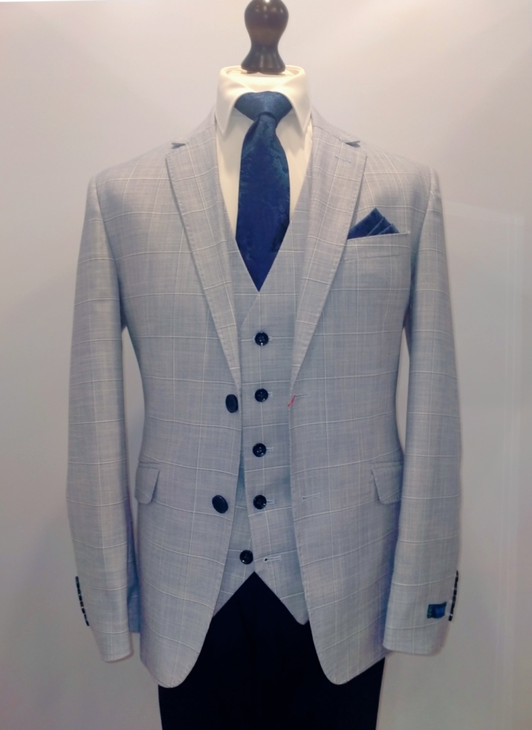 A modern grey check jacket and waistcoat paired with slim fit navy trousers. Ideal for all formal occasions.