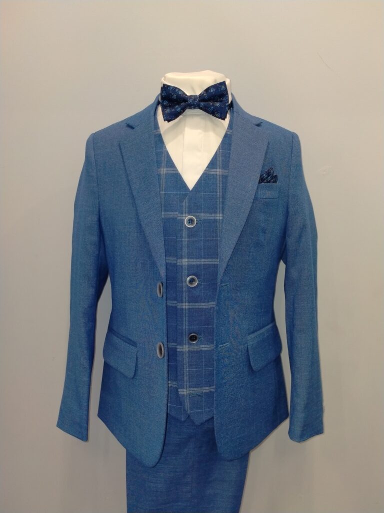 Premier, modern cut boys suit in rich sky blue and matching check waistcoat. Can be worn with a variety of neckwear and accessories.